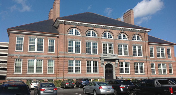 Patriot Restoration was selected as the masonry contractor to perform the exterior renovation of the historic Coddington Hall in Quincy Massachusetts. Coddington Hall was designed by renowned Boston architect Charles Brigham and constructed in 1909. The building which was originally utilized a grammar school and later as part of Quincy College, will now serve as the Quincy School Administration building. Patriot Restoration’s scope of work involved restoring the exterior of the building to its original appearance and correcting deterioration from more than a century of exposure to the elements. The scope of masonry restoration included repairs to masonry jack arches, replacement of damaged brick and granite trim, tuckpointing of brick joints, and repairs to the granite chimney caps and granite rubble foundation. Once the repairs were completed the entire façade was cleaned to remove more than 100 years’ worth of environmental staining while preserving the historic patina of the façade. A masonry sealer was applied to the facade to maintain the building into the future.