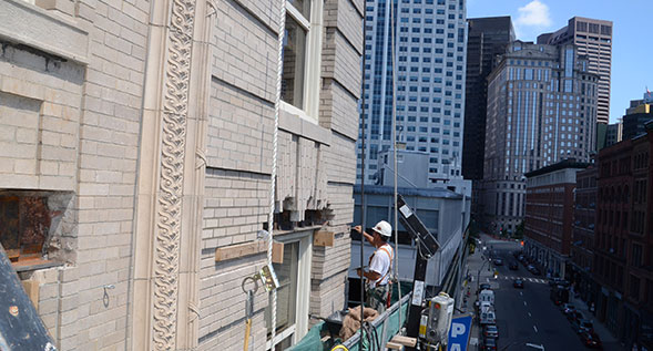 First constructed in the early 1900s, this mass-masonry building, located in Boston’s financial district, had a steel frame addition added after the initial construction. Plans were approved in 1900, the original construction of the eight-floor building was completed in 1903, and the 9th/10th-floor addition was completed in 1920. Over the years, water damage caused the steel structure to corrode and rust, causing displacement of the masonry. This $1.5M project consisted of 100% repointing of the original brick facade, complete replacement of precast masonry and relieving angles on the 9th and 10th floors (~300’ total), limestone patching, and replacement of the original sheet metal cornice with a GFRP replica produced by DurOFiber in New Hampshire. During the project, Patriot discovered that the column on the corner of Batterymarch and Milk Street, which was part of the early addition, had corroded so badly that one could see through the web in some places. Patriot brought in a structural engineer to work side-by-side and design/implement a program to thoroughly remove and replace the corner column while maintaining building operations and without schedule delays.