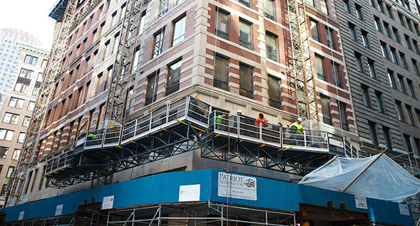 Avalon Bay Communities, which offers luxurious apartments with resort-style amenities, has been working with Patriot since 2008 at its flagship Boston property. Patriot worked with the property owner to develop a facade and window replacement program for the three high rise luxury apartment towers. In 2009 Patriot was awarded the $13.5 Million restoration contract to replace approximately 8,800 windows and doors along with a complete facade restoration program. Patriot worked with the building’s owner to coordinate concurrent construction at all three towers, along with the interior access required for the window replacement. At the height of the 14-month project, Patriot had 26 swing stage scaffolds in use. Patriot restored the brick and concrete facade elements, installed a protective waterproof coating to the concrete elements, and replaced over 35 miles of sealants. Patriot Restoration is currently performing a storefront and curtainwall replacement program at the site. All of the penthouse units recently had the exterior glass storefronts replaced with high performance insulated units. The same work is also being performed at the first and second-floor portions of the three towers. Patriot is also under contract to perform plaza and mezzanine structural repairs, waterproofing, landscaping, and hardscape upgrades to the facility. The entire package of repairs is slated to be completed by early 2016.
