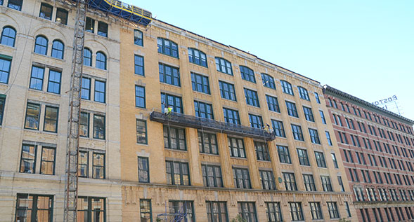 179 Lincoln Street is a historic property located in Boston’s leather district. Built in 1899, it was the recipient of a 2009 Preservation Achievement Award from the Boston Preservation Alliance. In 2013 Patriot started a multi-year preservation program under the oversight of Wessling Architects. The scope of the project involves the replacement and waterproofing of deteriorated structural steel lintels, masonry reconstruction at jack arches, masonry repointing, cast iron repairs and painting, along with the replacement of all exterior sealants. The combination of facade materials ranging from terra cotta, limestone, granite, cast iron and brick, along with ornate carved stone detailing, results in an interesting mosaic of textures on this building’s facade.